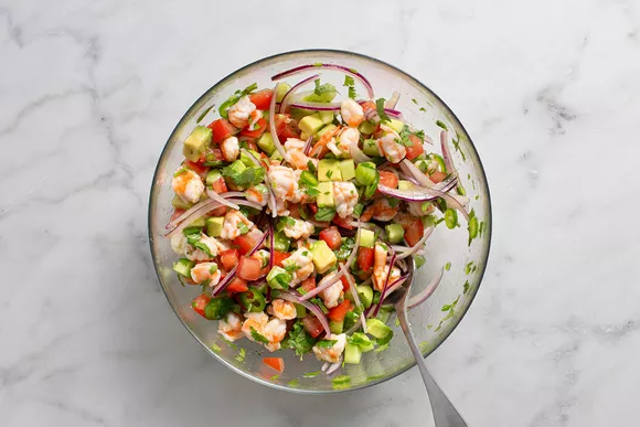 Слейте и сохраните маринад. К креветкам в тарелку добавьте оливковое масло, предварительно порезанные помидоры, огурец, лук, авокадо, острый перец и веточки кинзы. Тщательно всё перемешайте. Посолите по вкусу.