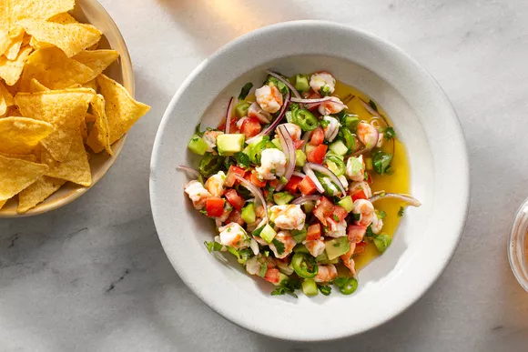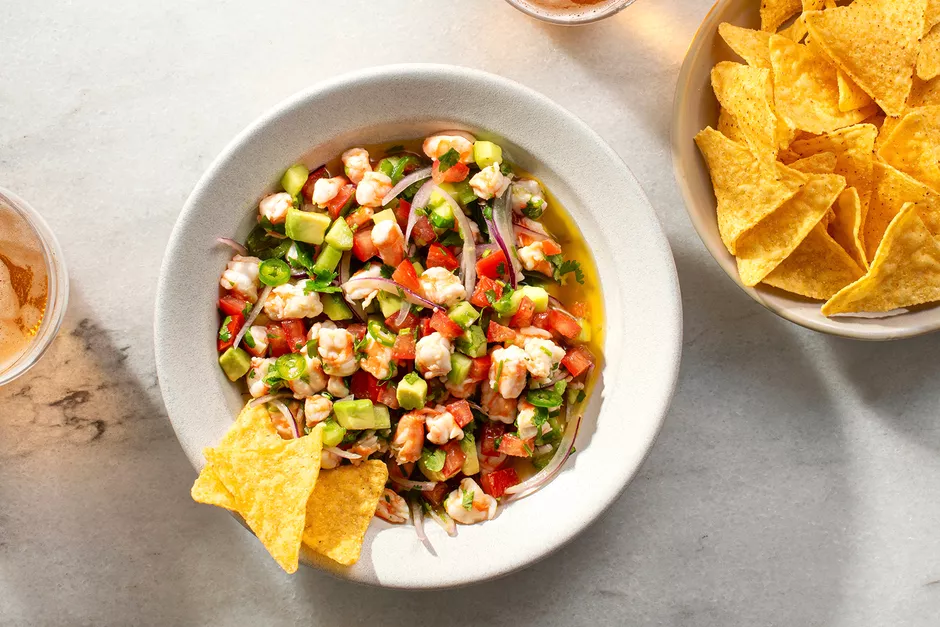 Севиче — блюдо из морепродуктов. Считается, что придумали его в Перу, а оттуда оно распространилось сначала по Южной Америке, а затем уже по всему миру. В Мексике более традиционен вариант приготовления севиче с креветками. Рецепт, представленный в этой статье, является наиболее распространенным. В нем креветки маринуются в соке лайма с нарезанными помидорами, огурцом, луком, острым перцем серрано и кинзой.