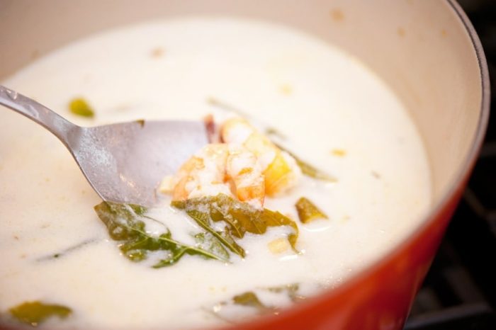 Затем выложить в воду все специи, включая цитрусовый и зелень. Одновременно выложить креветки. Сварить их до готовности, учитывая рекомендации выше. Если они в панцире, то он должен стать глянцевым – это свидетельство того, что они готовы.
