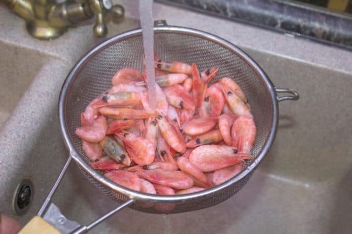- Размораживаются креветки и промываются от возможного мусора од проточной водой, которая должна быть обязательно холодной.