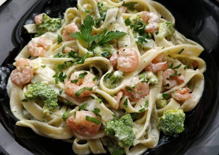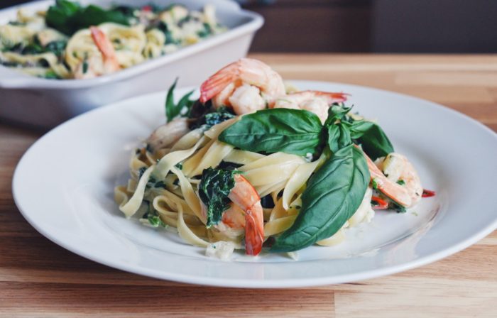 Получится рецепт по мотивам знаменитой в Америке пасты «Альфредо», которую очень любят американские детишки и не только. Креветки, как источник чистого белка, мы из состава исключать не будем. Так результат удовлетворит и детей, и взрослых, которые считают калории.