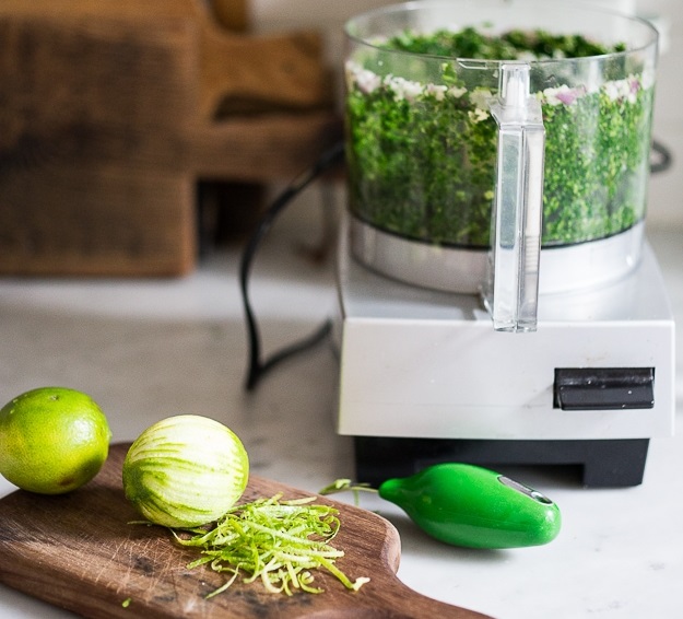 В кухонный комбайн или блендер положите чеснок и лук и измельчите. Добавьте по пучку трав и снова измельчите. Вылейте туда же масло, сок лайма, приправьте копченой паприкой (по желанию) и солью.