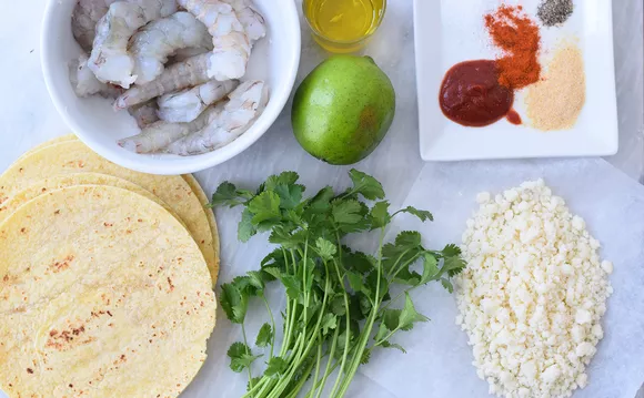 Креветки покрываются приготовленным острым соусом, обжариваются, смешиваются с салатом и подаются на кукурузных тортильях. Сверху на тако посыпают тертый твердый сыро и свежую кинзу. На готовку вам понадобится всего 26 минут.