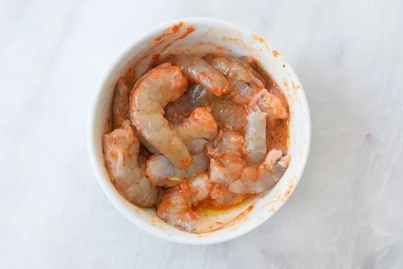Перемешайте в миске чесночный порошок, паприку, 1 чайную ложку соуса Шрирача, по 4 щепотки соли и перца, одну столовую ложку сока лайма и оливковое масло. Затем добавьте креветки и покройте их полученной смесью со всех сторон.