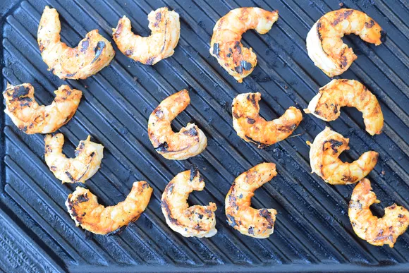 На гриле или сковороде-гриль обжарьте креветки на сильном огне до готовности, примерно по 2 минуты с каждой стороны. В крайнем случае подойдет обычная чугунная сковородка.