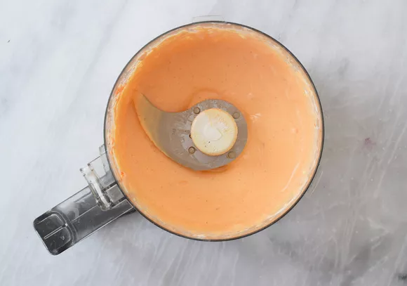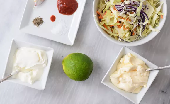 Добавьте майонез, греческий йогурт, соль и перец по вкусу, зубчик чеснока, 1 чайную ложку соуса Шрирача и 2 столовых ложки сока лайма в блендер или кухонный комбайн. Перемалывайте до получения однородной смеси. Попробуйте на вкус и при необходимости посолите и поперчите.
