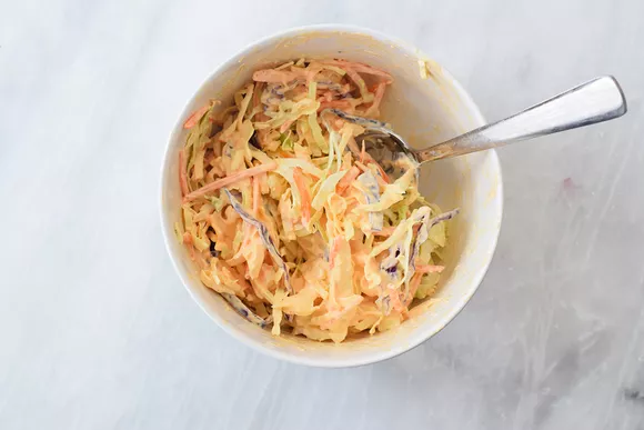 Перемешайте полученную заправку с капустным салатом в большой тарелке. Накройте и поставьте в холодильник, если не будете использовать сразу.