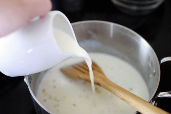 Подогреваем сливки, чтобы они не свернулись. Затем вливаем их к остальным продуктам. Добавляем кокосовое молоко (в тех пропорциях, которые указаны в рецепте).