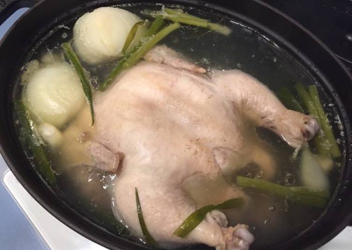 Изначально необходимо подготовить куриный бульон. Отвариваем курицу вместе с одной луковицей. Обращаем внимание, что солить воду не требуется.
