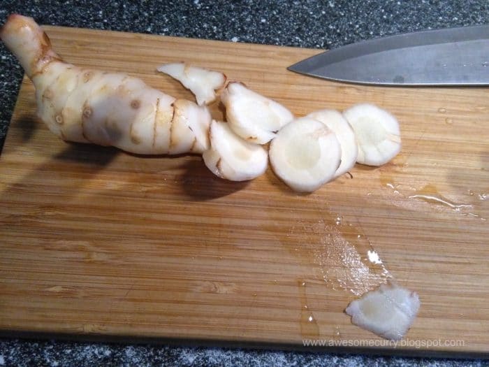 После этого следует нарезать галангал крупными колечками. Справка! Галангал является разновидностью имбиря, но имеет приятный сладковатый привкус.