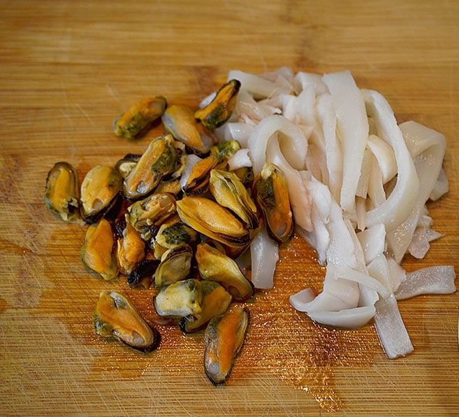 Размораживаем все морепродукты. Очищаем кальмары, нарезаем кольцами. Удаляем мякоть мидий из твердого панциря. Кладем их в суп, варим не более 2-3 минут.
