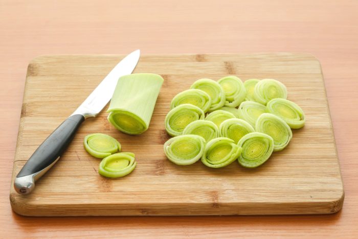 Нарезаем 5 колечек лука-порей, кладем в кастрюлю. Разрезаем напополам лайм, выдавливаем сок.
