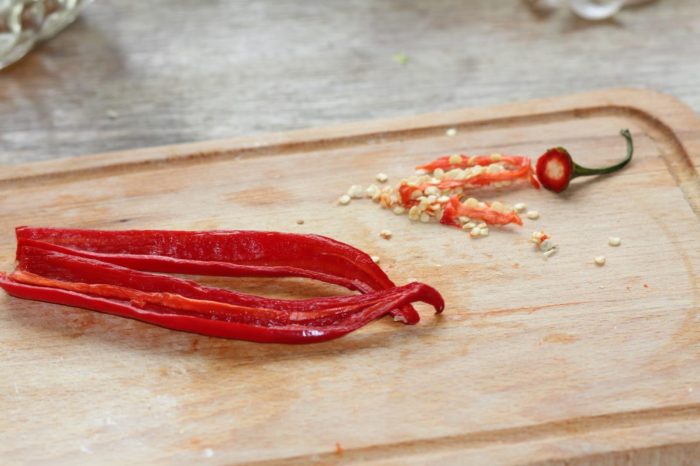 Далее чистим перец чили от жгучих семян и сердцевины.
