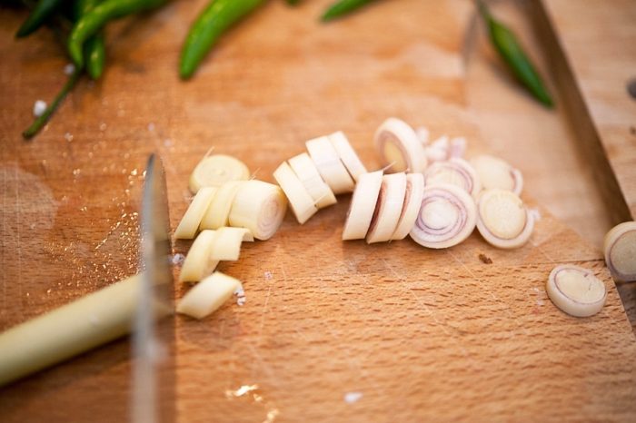 Следом нарезаем лемонграсс ломтиками по 3 сантиметра в длину. Так как даже после варки трава останется жесткой, перед подачей ее нужно обязательно вынуть из супа.
