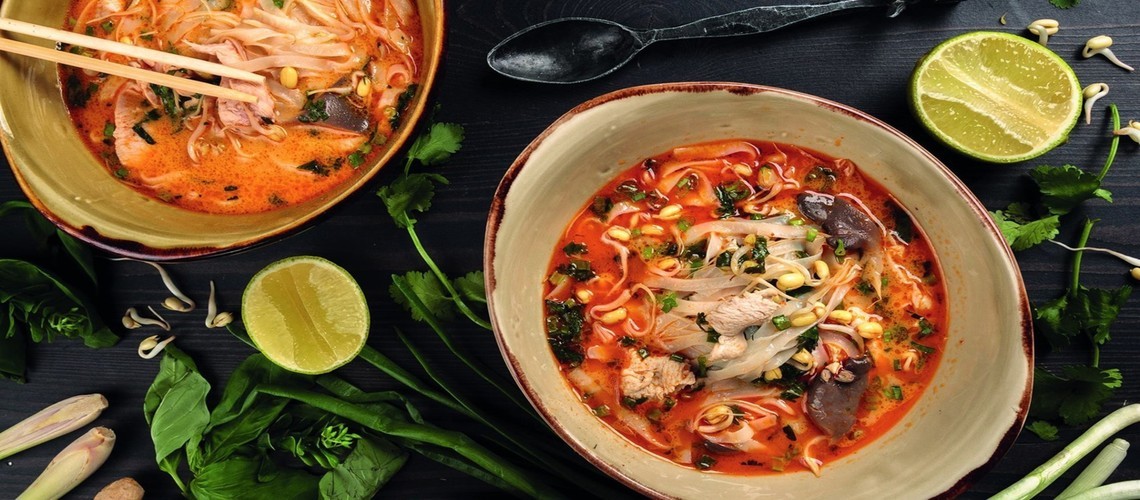Рекомендуем подавать блюдо с долькой лайма и пряным рисом, который снизит остроту азиатского супчика. Приятного аппетита!