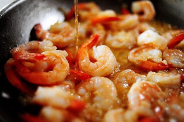 - В большую глубокую сковороду положить сливочное масло, растопить, выложить на него подготовленных ракообразных. Креветки в панцире на сковороде хорошо обжаривать с обеих сторон до румяного цвета, но не допускать их подгорания в течение 3 мин.