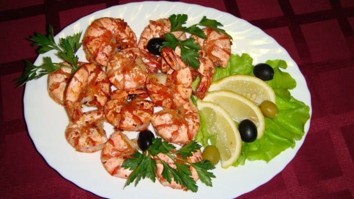 - Готовые креветки переложить в блюдо. Украсить дольками лимона, веточками базилика, маслинами.