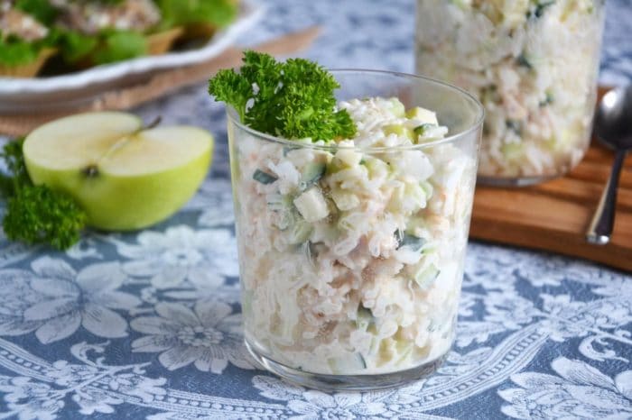 - Мясо рачков размять вилкой, соединить с рисом в салатнице;