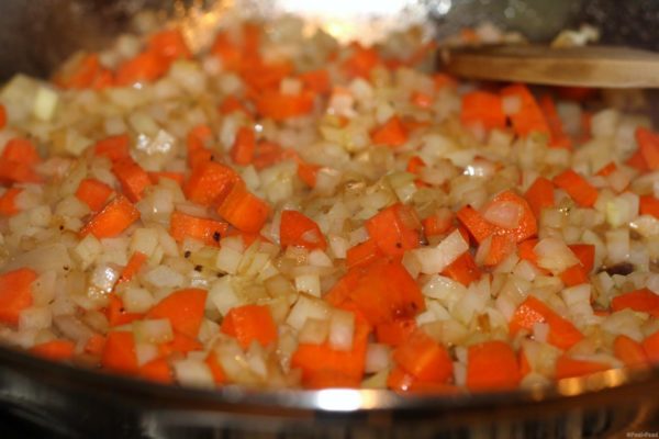 В сотейнике разогреваем растительное масло, кладем измельченный лук, морковь. Делаем золотистую обжарку.