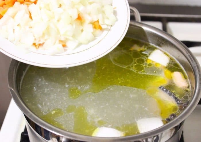 - Переливаем отвар в кастрюлю. Добавляем подготовленные овощи.