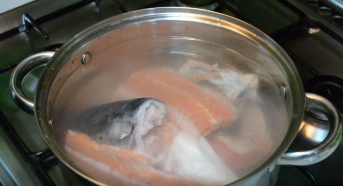 Ставим кастрюлю с водой на огонь. Солим и перчим. После того, как закипит, опускаем рыбу. Снимаем шумовкой белую пенку.