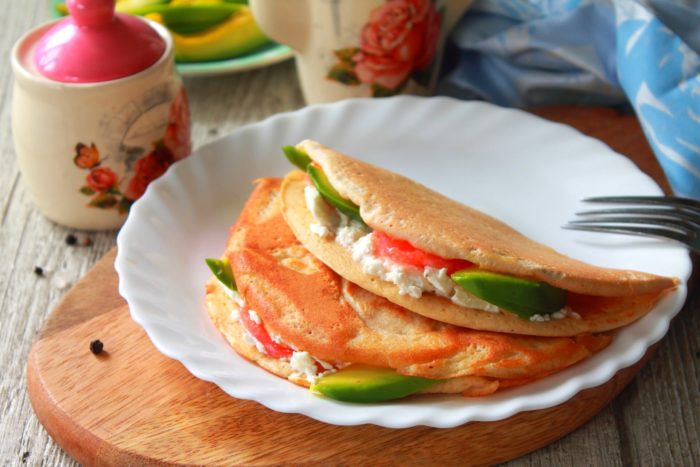 - Достать получившиеся блины и положить на плоскую поверхность. Начинку разложить на половину каждого овсяноблина, а затем свернуть их пополам.