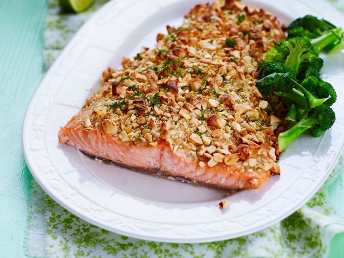 - По верху обмазать рыбу майонезом и насыпать кедровые орехи.