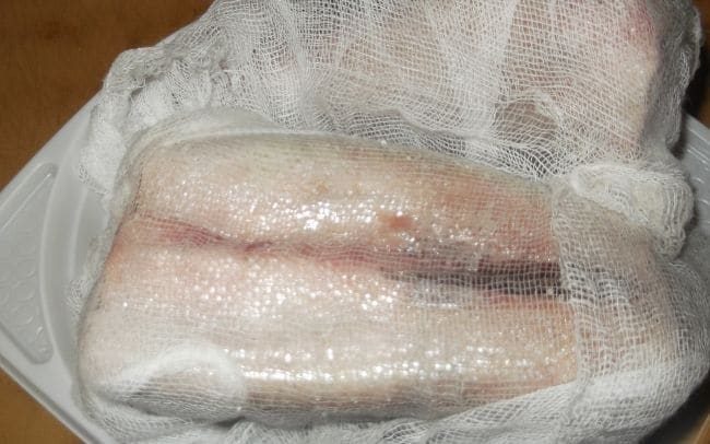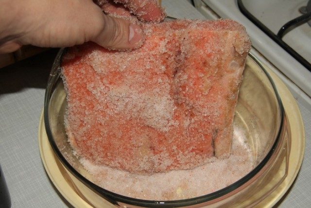 Мясо рыбы, при надавливании пальцем, упругое. Для того чтобы мясо хорошо просолилось, нужно порезать кусочками грамм по 250. Удалить хребет и аккуратно снять кожу.