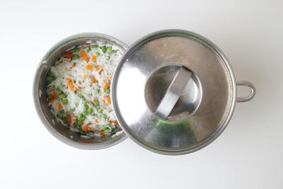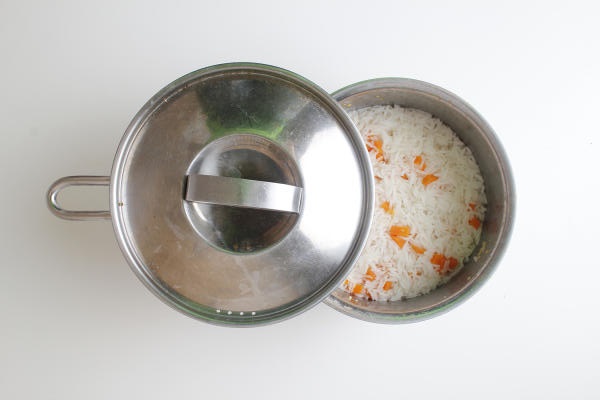 Включите духовку на 220 градусов. Морковь почистите и нарежьте мелким кубиком. В кастрюлю выложите рис, кубики моркови и залейте 350 мл холодной воды, поставьте на сильный огонь. Как только вода закипит, варите 10 минут под крышкой на слабом огне.