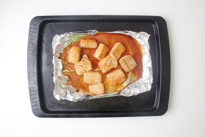 Противень застелите фольгой, выложите форель в маринаде. Запекайте 5-7 минут до готовности.