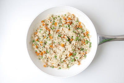Рис размешайте и выложите в сковороду к луку. Влейте оставшийся соевый соус и поперчите. Обжарьте еще 2-3 минуты и снимите с огня.