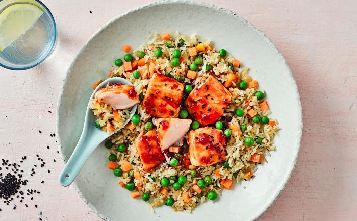 Рецепт этого блюда заимствован из азиатской кухни, но при этом адаптирован под наши продукты и вкусы. Приготовьте сливочный рис с горохом, морковью и луком в соевом соусе. Поверх риса подайте глазированную медовую форель.