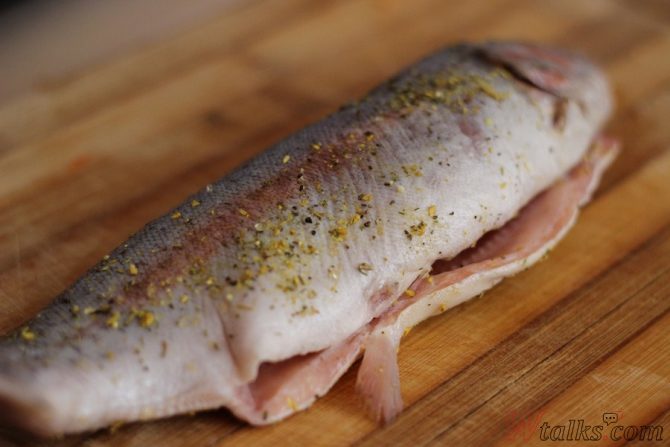 Форель необходимо выпотрошить и промыть. Если она довольно крупная, порезать ее на стейки. Если мелкая – оставить целой.