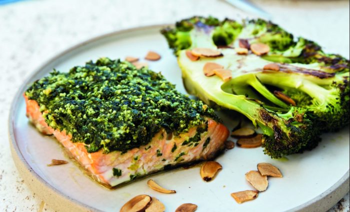 На тарелку выкладывается форель, заливается соусом, брокколи выкладывают рядом. На готовку уйдёт около получаса, а в итоге получится блюдо, на 100 грамм которого приходится 100 ккал, где БЖУ — 12,5/4,9/2,1 грамма.