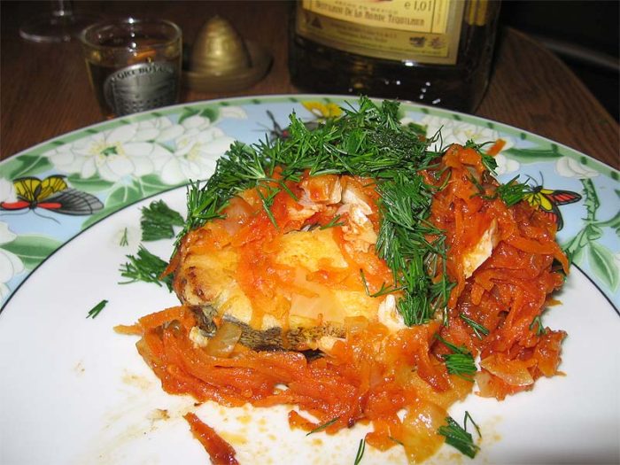 Засыпать сверху горбушу обжаренными луком и морковкой, накрыть крышкой и тушить 15 минут, убавив плитку до минимума. Готовую рыбку украсить свежей зеленью.