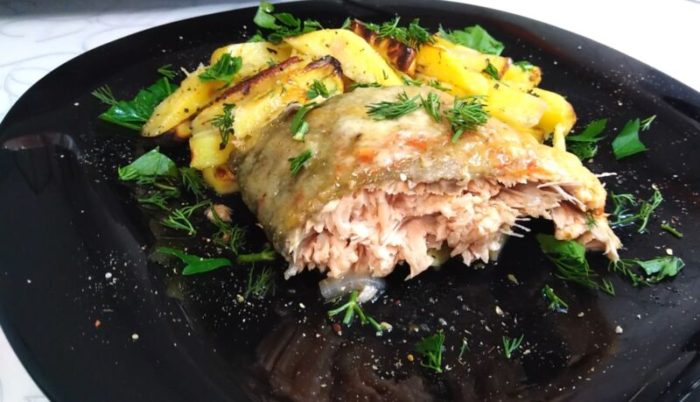 Горбуша получается по такому рецепту с хрустящей корочкой снаружи и сочной мякотью внутри.
