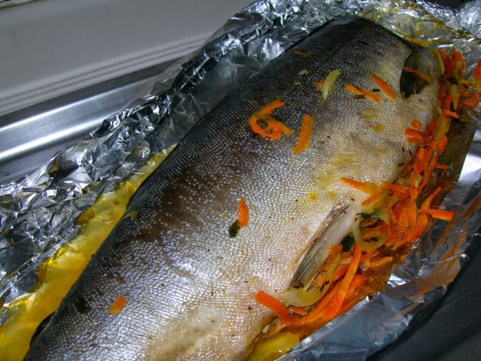 На жаровню покрытой фольгой и смазанной подсолнечным маслом, выложить нашинкованную рыбу, сбрызнуть подсолнечным маслом, обернуть фольгой и поставить на запекание, разогретую до 180 градусов на тридцать минут.
