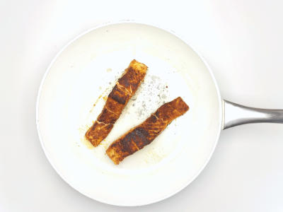 Другую антипригарную сковороду поставьте на средне-сильный огонь, влейте растительное масло. Как только масло нагреется, выложите горбушу в специях кожей вниз. Жарьте по 4-5 минут с каждой стороны до готовности.