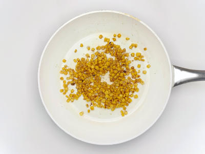 Из банки с кукурузой слейте жидкость. На сильный огонь поставьте антипригарную сковороду. Высыпьте кукурузу и жарьте 4-5 минут на сухой сковороде, постоянно помешивая.