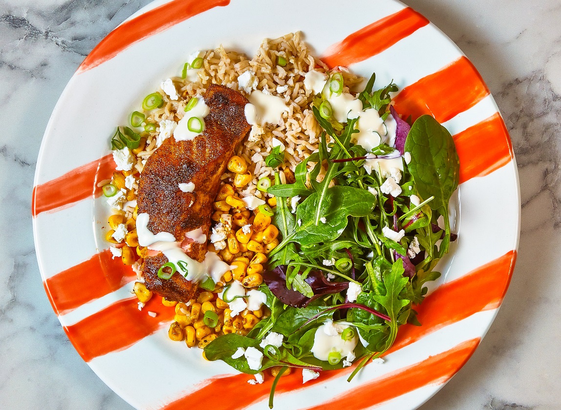 Это не только вкусное блюдо, но еще и очень быстрое и простое в приготовлении. Пока варится рис, обжарьте горбушу в течение нескольких минут. Затем приготовьте на другой сковороде кукурузу с перцем чили и домашний лаймовый соус. Не забудьте подать блюдо с большим количеством зелени и раскрошенным сыром фета.