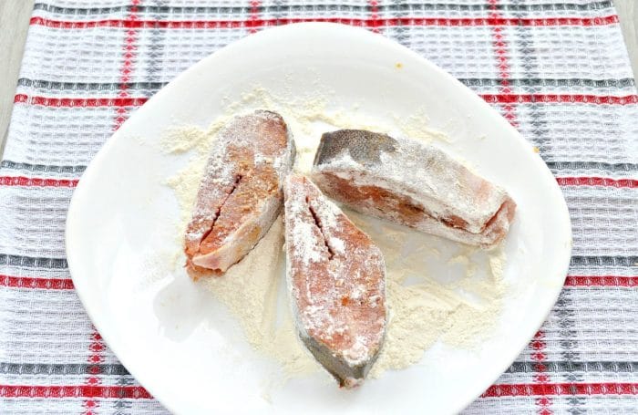 Разогреть масло на сковороде и обжарить лук и морковь почти до готовности. Горбушу обвалять в муке и на другой сковороде слегка обжарить.