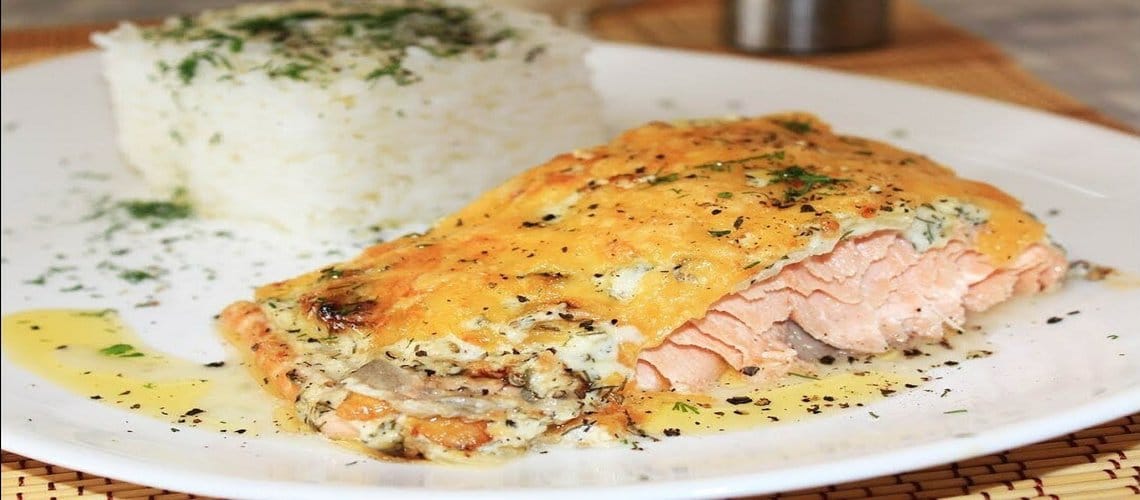 - На горбушу выложить обжаренный лук, и все залить сметанным соусом.