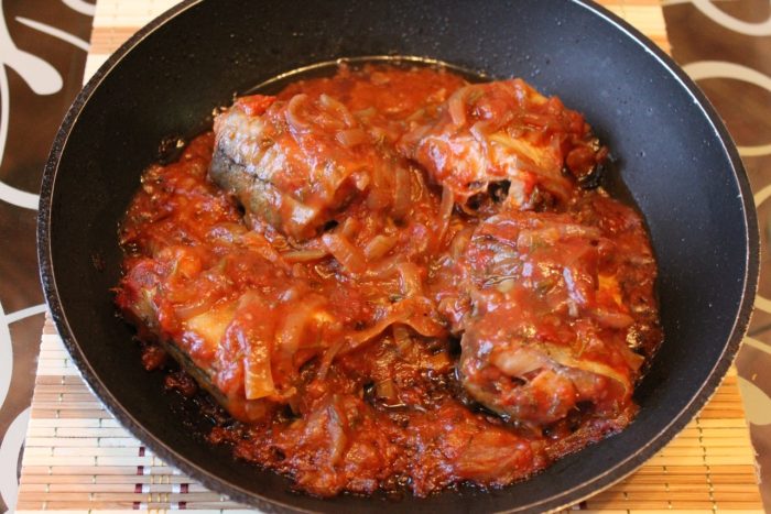 Обжаренную с двух сторон рыбу выложить в соус с овощами, огонь уменьшить до минимума. Блюдо тушится 15 минут.