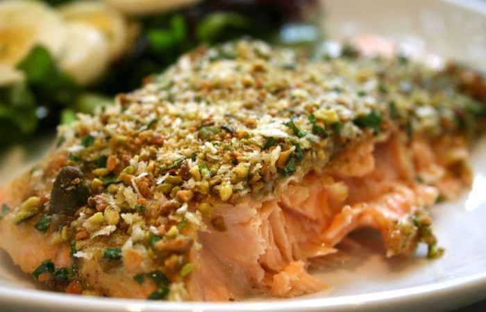 - Ни противень выложить овощи, рис, рыбу и посыпать все ореховой крошкой.