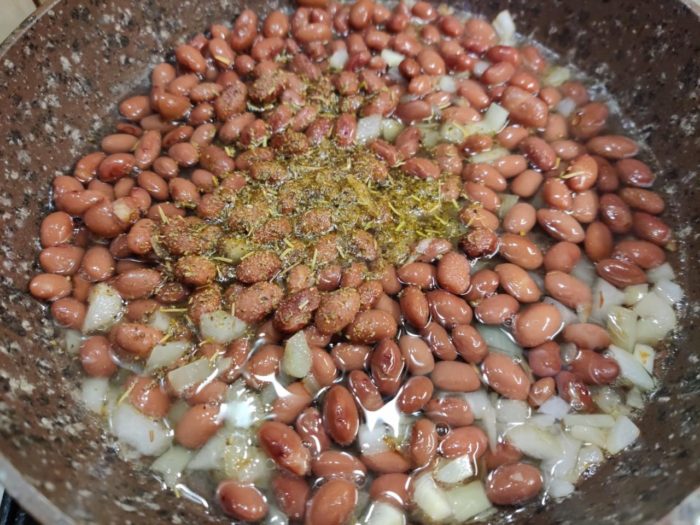 Лук с фасолью припустить на оливковом масле до мягкости, в конце добавить йогурт и хорошо перемешать.