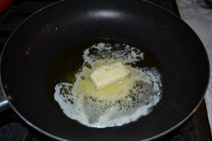 Налейте растительное масло и положите кусочек сливочного в антипригарную сковороду на среднем огне, вращая вокруг сковороды до тех пор, пока она хорошо не расплавится и не вспенится для вкусного кляра. Равномерно растопить сливочное масло на сковороде, а затем включите огонь
