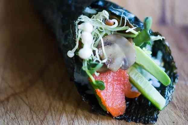 На стороне с рисом выложите полоски овощей по диагонали так, чтобы концы были направлены в верхний левый угол. Поверх овощей положите лосося, грибы и свежие ростки.