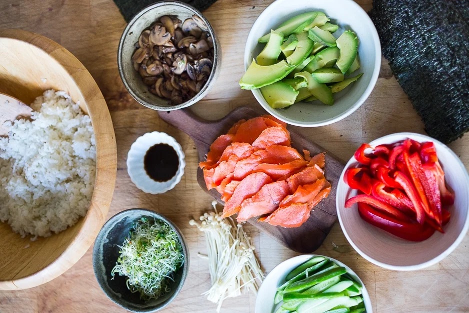 Хенд-роллы (они же темаки) с копченым лососем, рисом, авокадо, огурцами, грибами и свежими ростками — это здоровое, доступное и полезное блюдо в японском стиле. Оно подойдет для ужина большой семьи или даже для вечеринки, так как готовится сразу 8 порций. При этом они не потребуют много времени — управиться можно за час с небольшим.
