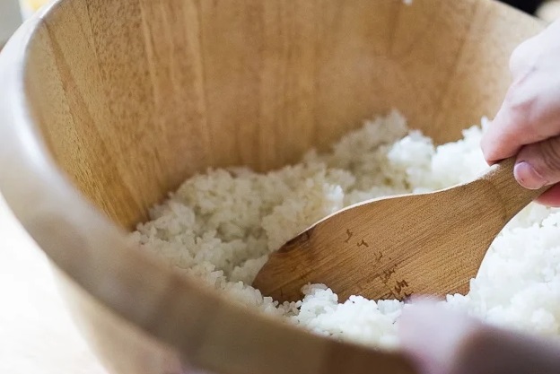 Приготовьте рис для суши. Хорошо его промойте, поместите в кастрюлю с 800 мл воды и щепоткой соли. Доведите до кипения, накройте и варите на медленном огне в течение 20 минут, не снимая крышку. Затем переложите его в тарелку и полейте рисовым уксусом. Перемешайте, посыпьте семенами кунжута и накройте влажным кухонным полотенцем.