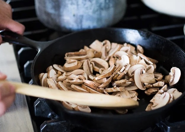 Обжарьте грибы в оливковом масле на среднем огне около 5 минут. Добавьте кунжутное масло и готовьте еще 2 минуты. Приправьте соевым соусом и переложите в небольшую миску.
